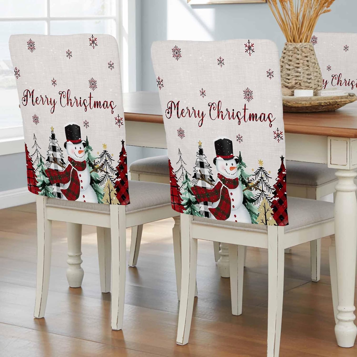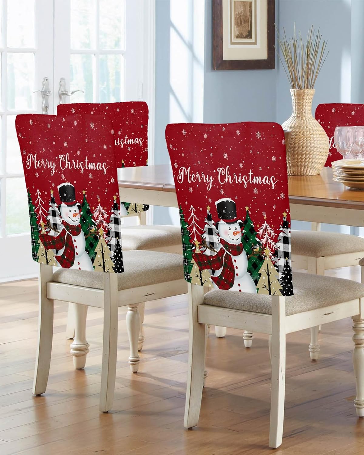 ❥Chair Back Cover Detail- Package include: 4 pcs chair covers.- Chair slipcover size: 19" x 18".- Tips: Please check the size before purchasing, it is recommended that you measure the back of the chair first.❥Durable Chair Back Protector- Outdoor chair cover has high color fastness and is not easy to fade under long-term sunlight, and can be used indoors and outdoors.- Patio chair cover is woven with high density, which can withstand pet scratches and is not easy to wear.- Chair covers for dining room set of 4 is not easily deformed after long-term use, and can be reused.❥Good Performance1.High chair cover restaurant protects against dust, oil stains and all kinds of food spills.2.Chair cushion covers foros para sillas de comedor keep kids from scribbling on chairs.3.Office chair covers can cover up ugly marks on the chair.4.Dining chair seat cover protects the chair from scratches and bites by pets.5.Birthday chair cover avoid sharp objects from scratching the chair.5.Soft and comfortable party chair covers can provide you with winter warmth.❥Decorative Chair Covers- High chair cover replacement can be matched with various styles of dining table chairs, placemats, tablecloths, table runners and cutlery to enhance your dining experience.- Chair back covers cobertores para sillas de comedor are widely used in various occasions such as family dinners, banquets, weddings, parties, celebrations and conference decorations.- Cover chair forros de sillas de comedor is not only the perfect companion for the dining room, but also suitable for the kitchen, bedroom, living room, office, cafe, hotel, bar and more.❥Perfect Holiday GiftsCover for chair cover para sillas de comedor are also special Christmas gifts for family, friends and loved ones to convey your best festive wishes for the upcoming New Year!