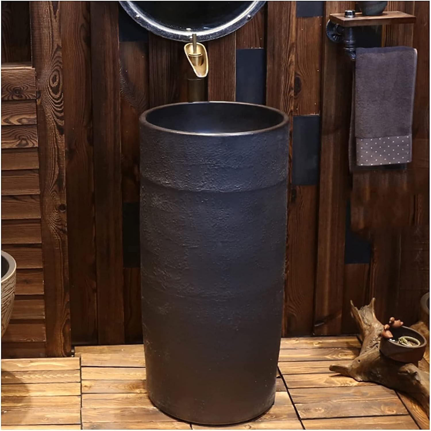 Full Pedestal Art Bathroom Basin Sink Pedestal Sink Handmade Ceramic Basin Pedestal Basin Kaolin Clay Round Freestanding Sink with Drain and Faucet (E with Mirror)