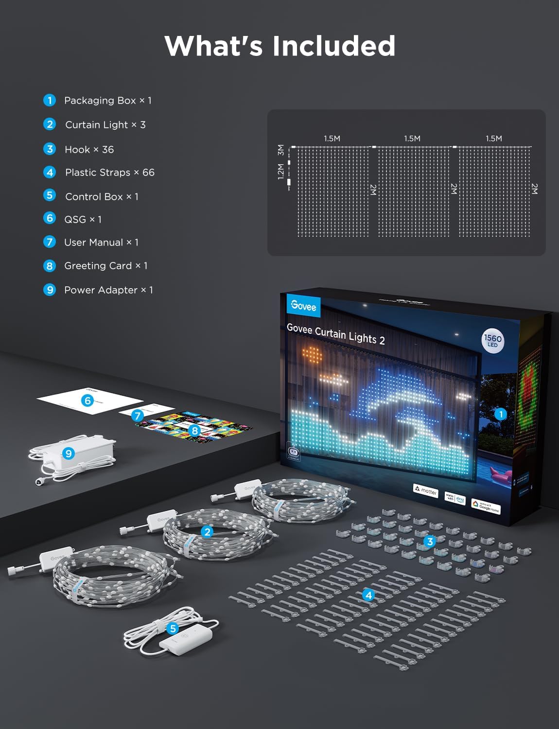 | Included Components | Curtain Light x1, Hook x12, Power Adapter x1, Control Box x1, QSG x1, User Manual x1, Greeting Card x1, Plastic Strap x22 |